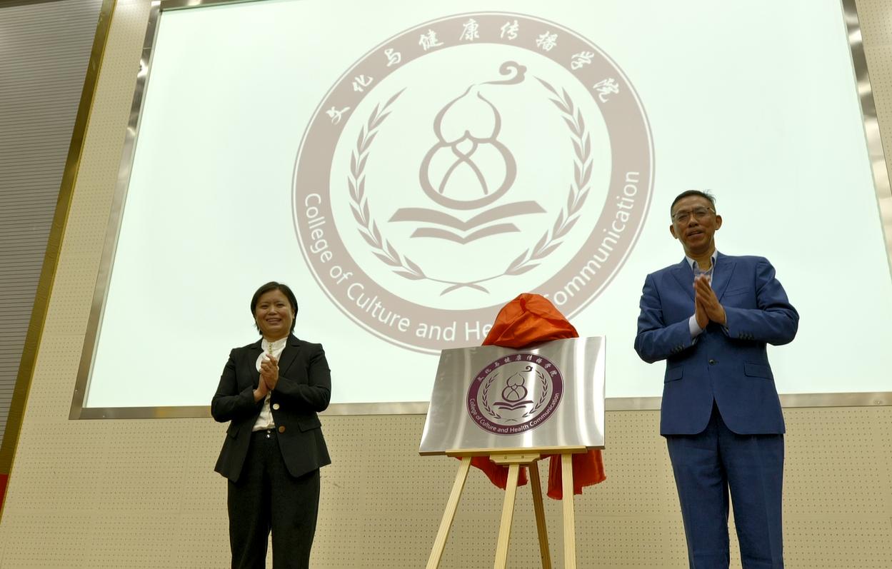 薛晓娟书记与毛国强院长为文化与健康传播学院院徽揭牌