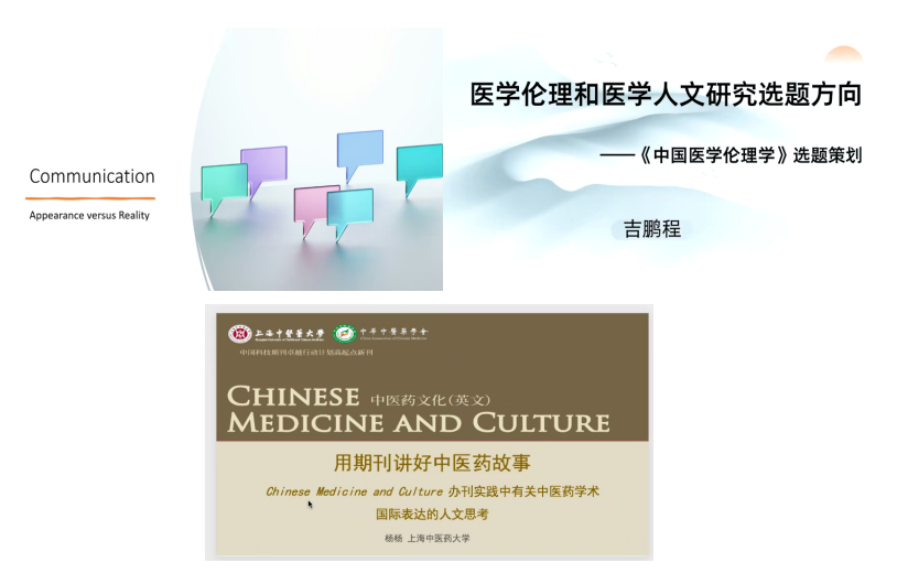 下午的分论坛由文化与健康传播学院传播学教研室杨一丹副教授主持,李臻怡、吉鹏程、杨杨三位专家先后作了精彩报告。李臻怡教授在题为《从传播本质看中医药跨文化传播的前景》的报告中,基于communication的内涵与本质讲述了当今人工智能高速发展的形势下中医药跨文化传播的问题。吉鹏程主任在题为《医学伦理和医学人文论文选题的前沿方向》的报告中分享了《中国医学伦理学》期刊的选题策划实践,从热点问题、研究思路和选题原则等方面为医学伦理和医学人文学科的学术论文写作指明了方向。杨杨编辑在题为《用期刊向世界讲好中医药故事——〈中医药文化(英文版)〉办刊实践中有关中医药学术国际表达的人文思考》的报告中分享了中医药人文领域学术期刊的背景资料以及Chinese Medicine and Culture的办刊实践、探索历程、未来聚焦领域、工作方向、投稿指南等。