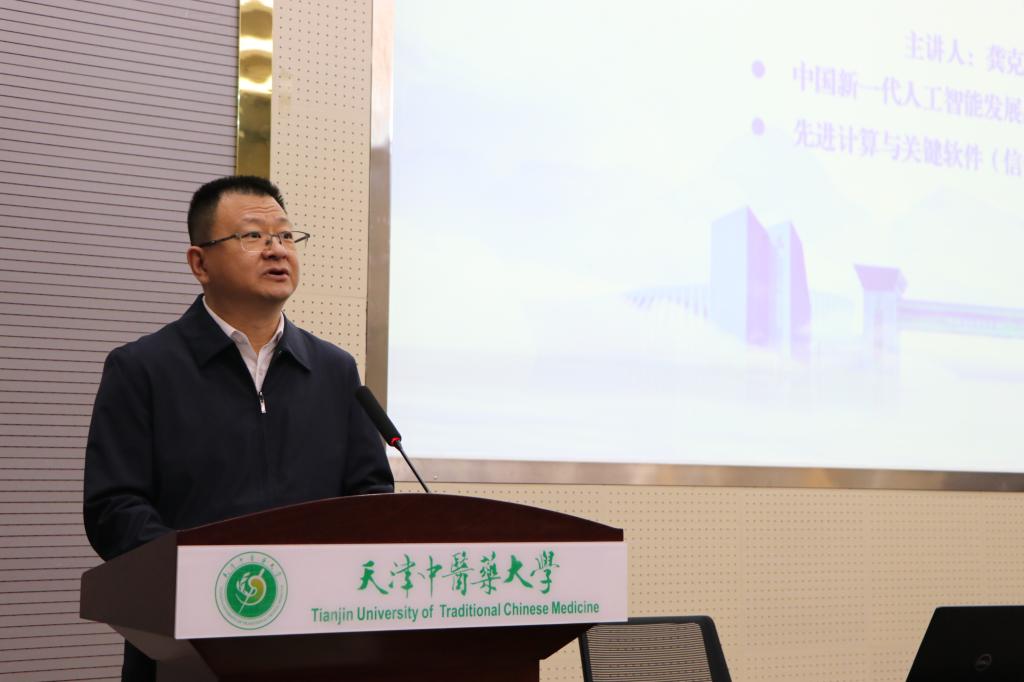 10月21日下午,应我校杏林干部大讲堂和我院人文名家讲坛之邀,中国新一代人工智能发展战略研究院执行院长、先进计算与关键软件(信创)海河实验室主任龚克教授在求真报告厅开展了人工智能主题报告。天津中医药大学校长高秀梅教授、党委副书记张华泉、市纪委监委驻天津中医药大学纪检监察组组长柳春敏,天津中医药大学原副校长、天津市计算机学会理事长孟昭鹏教授与会。讲座由校党委副书记张华泉主持。来自学校各职能部门和二级学院领导干部、各学院师生代表200余人参会。