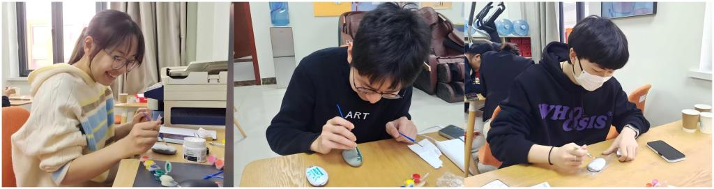 在手绘廉洁石头环节,现场气氛热烈而有序。学生党员们领取石头、颜料、画笔等材料后,迅速投入创作。大家围绕“廉洁”主题,充分发挥想象力和创造力,有的以“莲花”为原型,勾勒出“出淤泥而不染”的清雅姿态;有的绘制“廉”字书法,笔锋刚劲有力,彰显廉洁决心;还有的将“竹”“梅”等象征高洁品格的意象融入作品。2022级传播学专业的学生党员袁兆威表示:“亲手绘制廉洁石头的过程,也是对廉洁理念的再学习、再深化,这样的形式既有趣又有意义,让廉洁二字更加鲜活可感。”