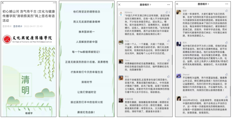 清明节期间,文化与健康传播学院举办了“清明祭英烈”网上签名寄语活动,同学们积极参与,表达自己的缅怀之情。活动中,同学们进一步了解了烈士们为祖国为人民抛头颅、洒热血,不惜牺牲自己生命的感人事迹,更深刻地体会到了先烈们那种坚贞不屈、英勇无畏的高贵品质和革命精神。他们纷纷表示,要继承先烈的遗志,努力学习,奋勇拼搏,勇敢地挑起建设祖国的重担,把热爱党、热爱祖国、热爱人民化为实现中华民族伟大复兴的力量。