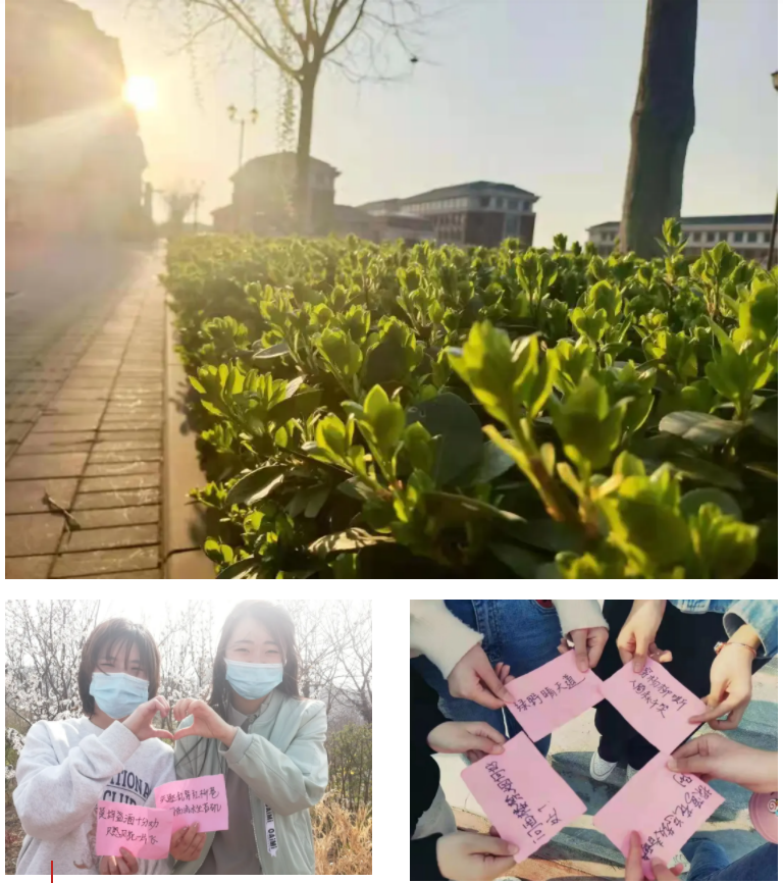 疫情突如其来,春天如期而至。从操场到如意药岭,大家在花海里拾取春意,在诗词中不负春光,营造“拥抱春天·表达态度”的良好氛围,将自己在这段特殊时期的所思所想所见通过拍摄美景凝练,传递一份份积极向上的青春正能量。同学们在学院精心准备的香囊里,惊喜地发现了许多关于春天、清明节的诗句:“沾衣欲湿杏花雨,吹面不寒杨柳风”、“好雨知时节,当春乃发生”、“清明时节雨纷纷,路上行人欲断魂”、“江南无所有,聊赠一枝春”……读书不觉春已深,大家追随古人的脚步,于诗文中寻找春色,相信爱与希望终会战胜疫情。